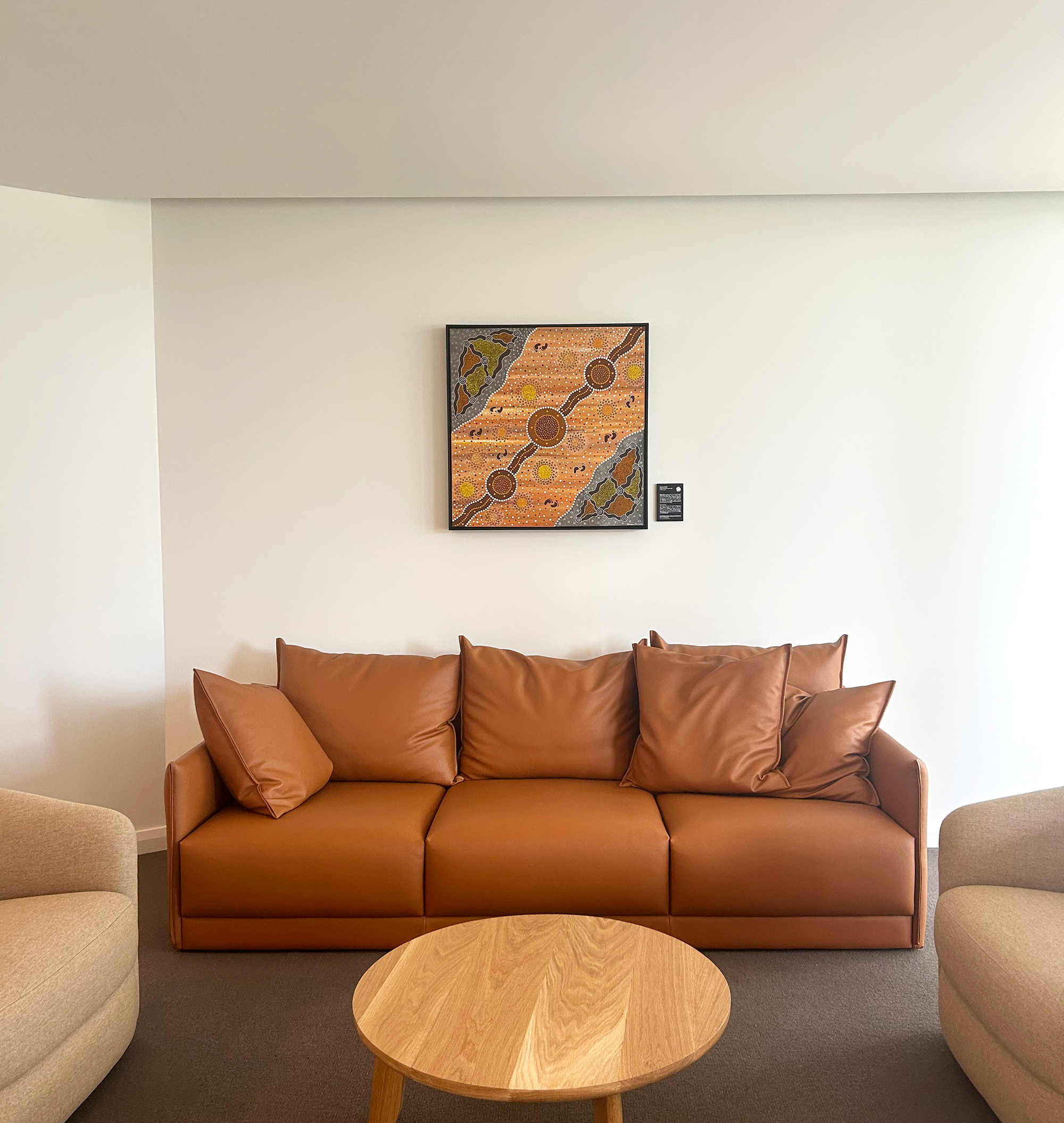 Artwork Spotlight: This beautiful Sharon Smith painting is located in a communal break out on the ground floor. Sharon Smith is a descendant of the Wiradjuri tribe of Western New South Wales. She says of this work: “The smaller circles are our ancestors’ resting places after traveling looking for water and food. The footprints of our ancestors are known as song lines which are part of our creation. Each tribe had their own song line passed down to them by their ancestors. These song lines trace the journeys of ancestral spirits who created the land.”